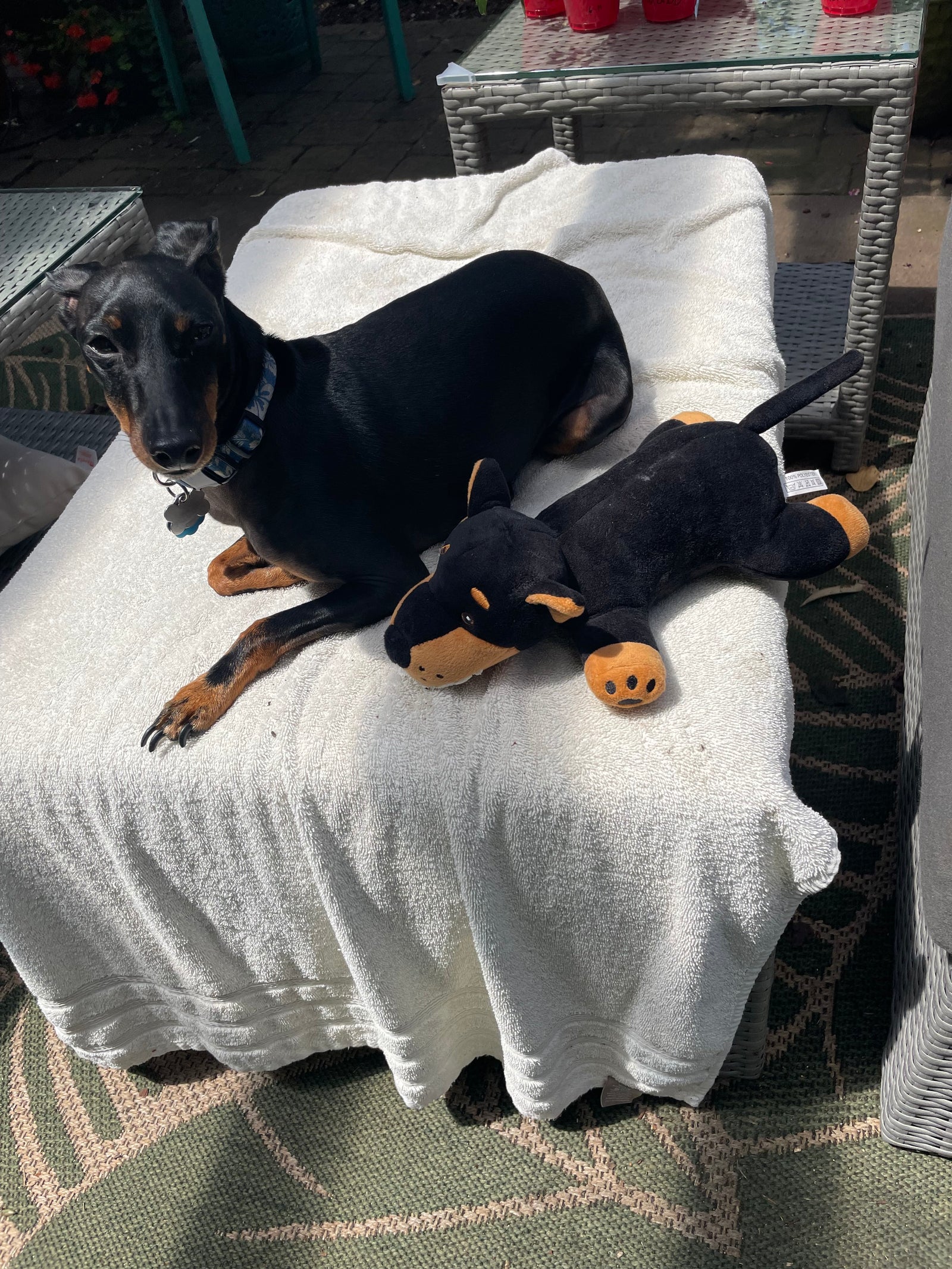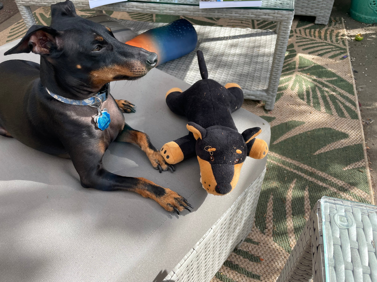 DogDog began as a search for the perfect dog toy for our dog Archer, a black and tan Manchester Terrier. We were searching for a toy that looked like Archer, even going as far as ordering a large $200 look-a-like toy, which left us very disappointed. We were looking for a smaller, puppy-sized toy that could be a best friend for the dog and take some small chewing without disintegrating. So, we decided to design our own and begin the adventure of DogDog!